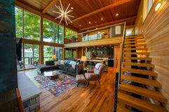 Perched high in the trees with panoramic mountain and valley views, Top of the Rock Cabin lives up to its name—delivering one of the most scenic, design-rich stays at The Tree Lofts. This elevated hideaway blends rustic charm with modern convenience, featuring cozy interiors, a full kitchen, streaming entertainment, and even a record player for nostalgic evenings. Enjoy your morning coffee on the balcony, explore the surrounding forest during the day, and end your night by the fire pit or curled up with a book and a view. With thoughtful amenities, sweeping vistas, and total privacy, this cabin is made for peaceful getaways and memorable weekends.